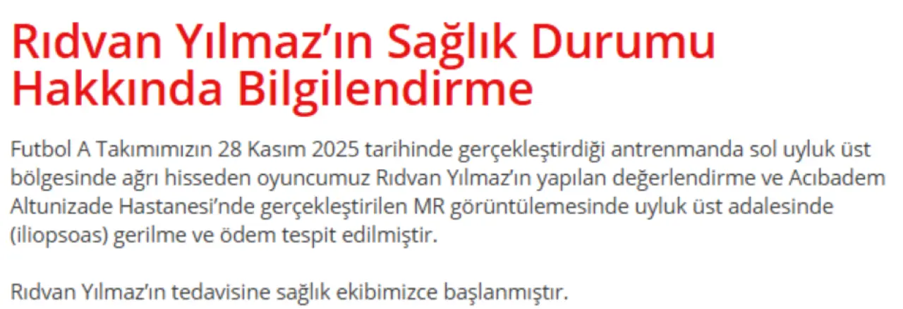 "Futbol A takımımızın 28 Kasım tarihinde gerçekleştirdiği antrenmanda sol uyluk üst bölgesinde ağrı hisseden oyuncumuz Rıdvan Yılmaz'ın yapılan değerlendirme ve Acıbadem Altunizade Hastanesi'nde gerçekleştirilen MR görüntülemesinde uyluk üst adalesinde (iliopsoas) gerilme ve ödem tespit edilmiştir.”