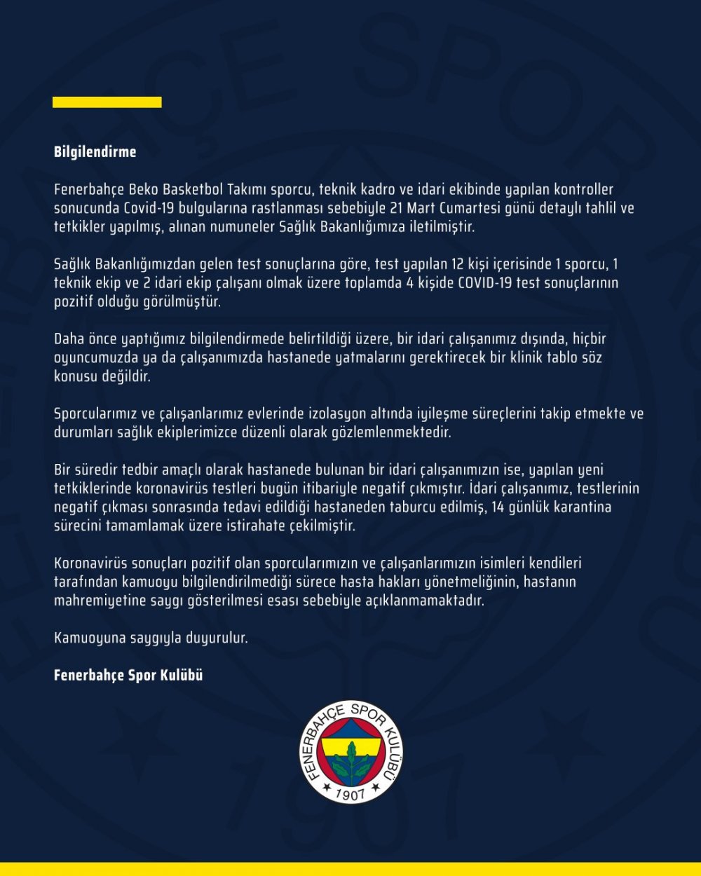 "Fenerbahçe Beko Basketbol Takımı sporcu, teknik kadro ve idari ekibinde yapılan kontroller sonucunda Covid-19 bulgularına rastlanması sebebiyle 21 Mart Cumartesi günü detaylı tahlil ve tetkikler yapılmış, alınan numuneler Sağlık Bakanlığımıza iletilmiştir.