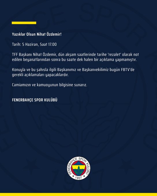 Fenerbahçe, TFF Başkanı Nihat Özdemir'in dün yaptığı “2010-11 sezonunu yaşadık, 9 sezon geride kaldı. 9 senedir herhangi bir şekilde şike olayına rastlamadık. Amatör liglerde de şikayetler geliyor, Etik Kurulumuz inceliyor. Bunlarla ilgili herhangi bir şey yakalayamadık ama yakaladığımız zaman meselenin üzerine gideriz. Biz görevimizin başındayız. Bu federasyon, gerçekten çok zor bir görev, inanılmaz zor bir görev. Aldığınız her karar, birilerinin hoşuna gidiyor, birilerine yarıyor gibi düşünüyorlar” açıklamasının ardından resmi internet sitesinden çok sert tepki gösterdi.