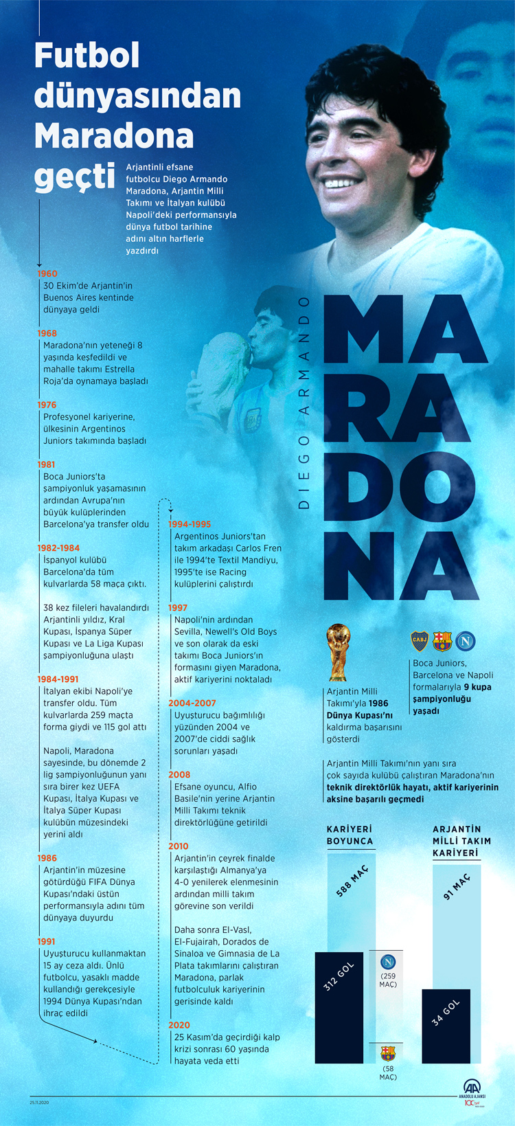 Yunus Kaymaz (AA) - Geçirdiği kalp krizi sonrası 60 yaşında hayata veda eden Arjantinli efsane futbolcu Diego Armando Maradona, ardında unutulmayacak bir kariyer bıraktı.