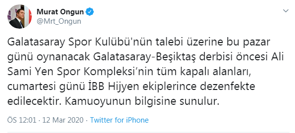 Bu pazar oynanacak Galatasaray Beşiktaş maçı öncesinde Sarı Kırmızı kulüp, İstanbul Büyükşehir Belediyesi'nden Ali Sami Yen Spor Kompleksi'nin dezenfekte edilmesini talep etti. Söz konusu isteği İBB Sözcüsü Murat Ongun kamuoyu ile paylaşırken şu ifadeleri kullandı: "Galatasaray Spor Kulübü'nün talebi üzerine bu pazar günü oynanacak Galatasaray-Beşiktaş derbisi öncesi Ali Sami Yen Spor Kompleksi’nin tüm kapalı alanları, cumartesi günü İBB Hijyen ekiplerince dezenfekte edilecektir. Kamuoyunun bilgisine sunulur.