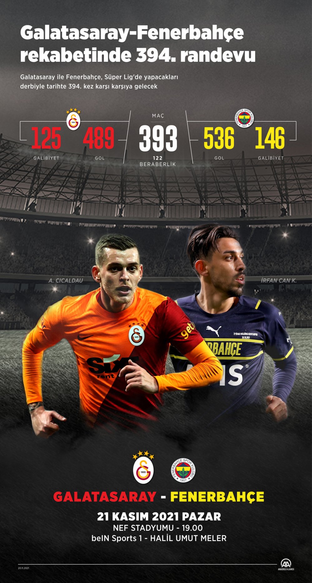 Galatasaray ile Fenerbahçe futbol takımları, Spor Toto Süper Lig'de yarın yapacakları derbiyle tarihte 394. kez karşı karşıya gelecek.