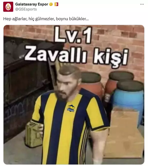 Galatasaray Espor'un resmi X (eski adıyla Twitter) hesabından yapılan paylaşım, maçın önüne geçecek kadar konuşuldu. Paylaşımda Fenerbahçe formasını giyen bir karakterin üzerinde “Lv.1 Zavallı kişi.” ifadesinin yer aldığı bir görsel kullanıldı. Altına ise şu not düşüldü: