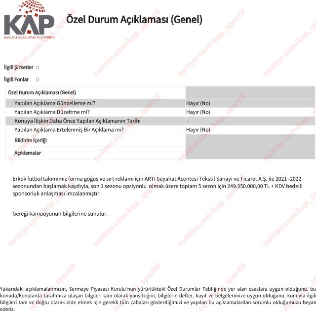 "Erkek futbol takımımız forma göğüs ve sırt reklamı için ARTI Seyahat Acentesi Tekstil Sanayi ve Ticaret A.Ş. ile son 3 sezonu opsiyonlu olmak üzere toplam 5 sezon için 249.350.000, 00 TL + KDV bedelli sponsorluk anlaşması imzalanmıştır."