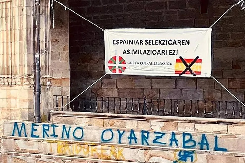 Futbolcunun annesinin memleketi olan Biscayan kasabası Elorrio'da Oyarzabal ve takım arkadaşı Merino'nun İspanya Milli Takımı'nda oynamasına tepki gösteren pankartlar asıldı.