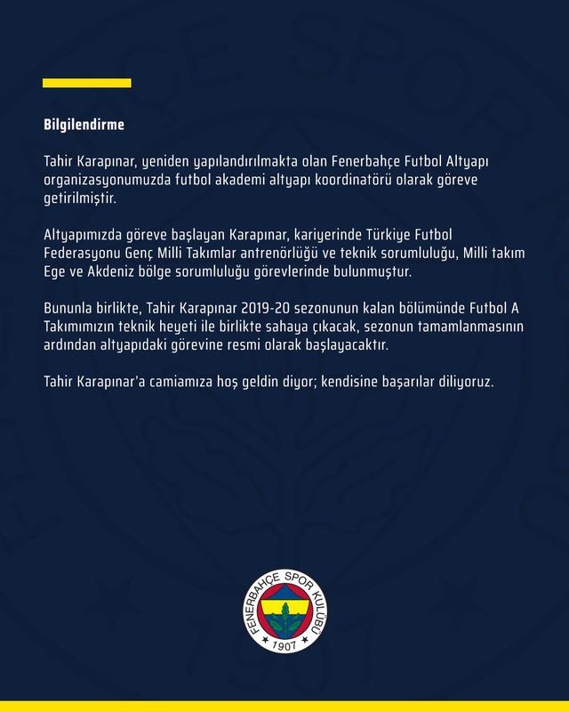 Fenerbahçe Kulübü, teknik direktör Tahir Karapınar'ın 8 haftada takımın başında olacağını resmen açıklandı.