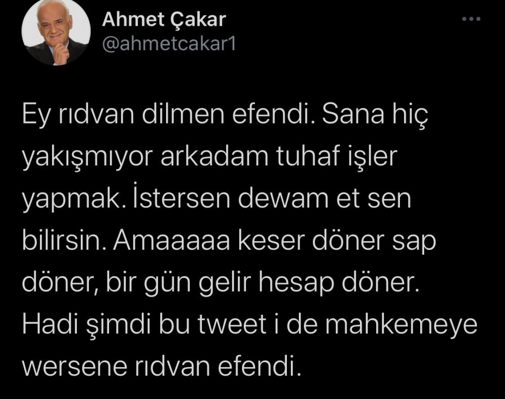 Bu kez de Ahmet Çakar, Rıdvan Dilmen'e ağır sözlerle yüklendi. Çakar'ın mesajları şöyle: