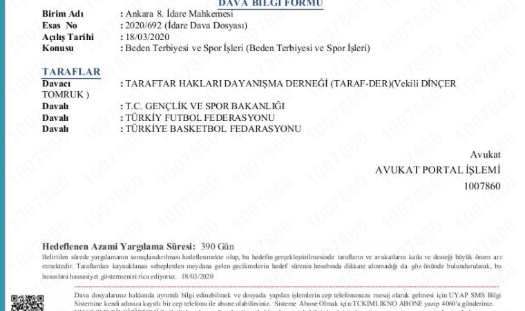 Ankara 8. İdare Mahkemesi'nde Gençlik ve Spor Bakanlığı, Türkiye Futbol Federasyonu ve Basketbol Federasyonu aleyhinde açılan davanın dilekçesi aynen şöyle: