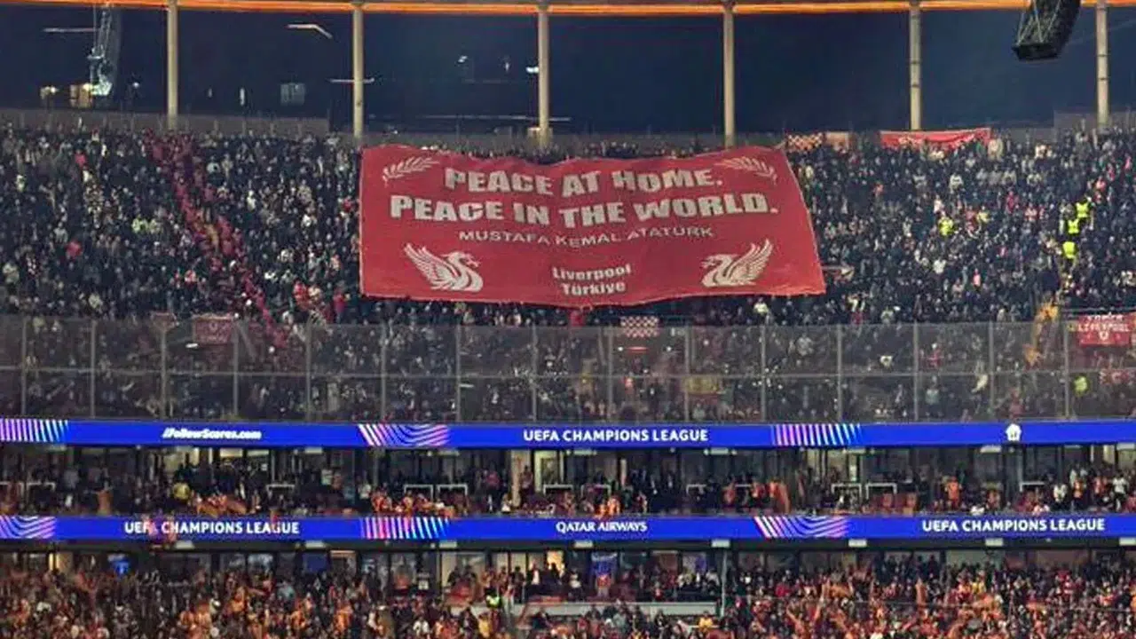 Karşılaşmayı deplasman tribününden takip eden Liverpool taraftarları, Türkiye Cumhuriyeti’nin kurucusu Gazi Mustafa Kemal Atatürk’ün dünya barışı vurgusu yapan sözünü pankartla tribünlere taşıdı.