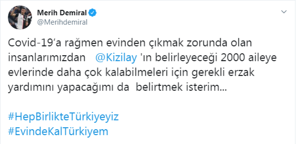 Demiral, "Covid-19'a rağmen evinden çıkmak zorunda olan insanlarımızdan Kızılay'ın belirleyeceği 2000 aileye evlerinde daha çok kalabilmeleri için gerekli erzak yardımını yapacağımı da belirtmek isterim..." dedi.