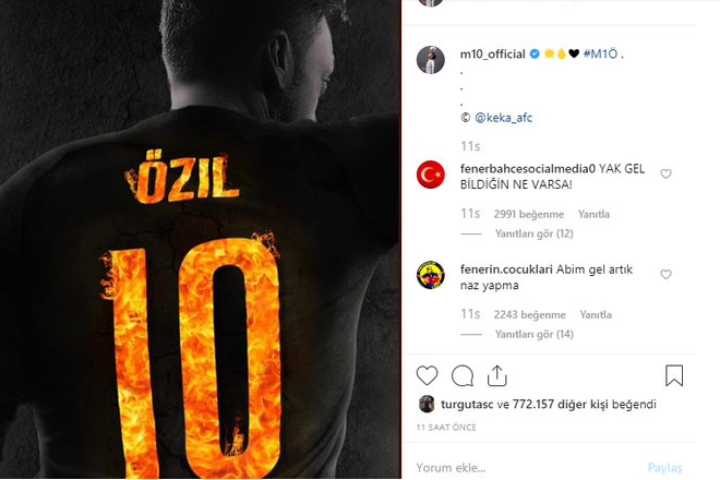 Mesut Özil'in dün akşam Instagram hesabından yaptığı alevli 10 numara forma paylaşımı, Fenerbahçe'nin transferlerini açıklamadan önce paylaştığı alev emojisine benzetildi.