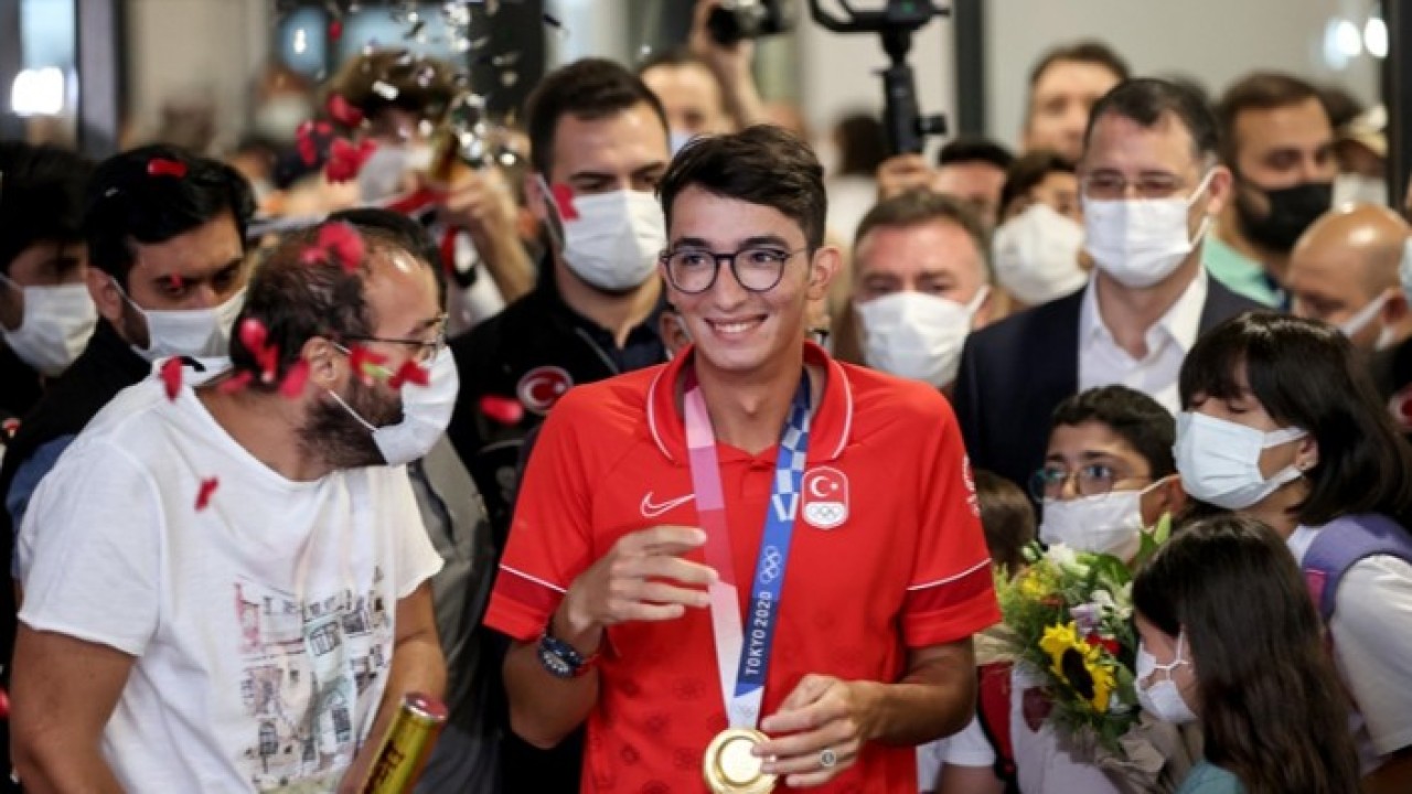 Olimpiyat şampiyonu için terminal çıkışında konfetiler atılırken, milli sporcu sevenleriyle hatıra fotoğrafı çektirdi.