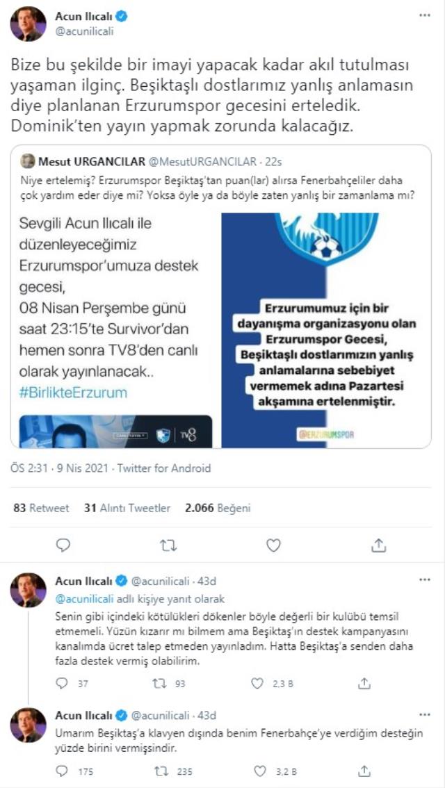 Beşiktaş maçı öncesi Erzurumspor için destek gecesi düzenleyecek Acun Ilıcalı, siyah-beyazlı taraftarlardan gelen tepki sonrasında etkinliği ertelemişti.