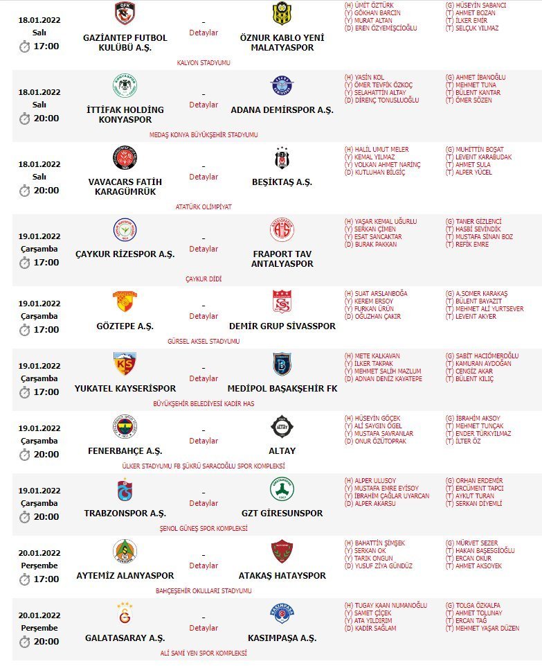 Süper Lig'de 22. haftanın hakemleri açıklandı. Haftanın programı ve hakemleri şöyle: