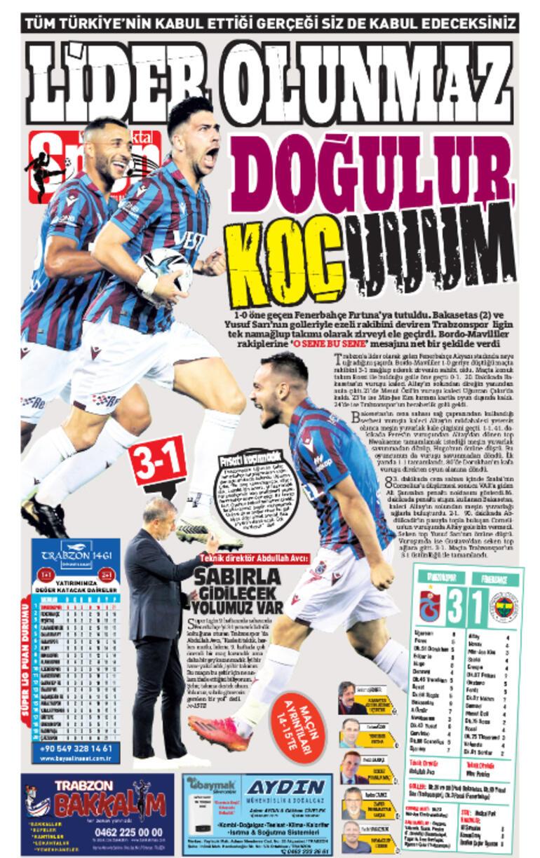 Karadeniz gazetesi, ilk sayfasında "Ayağa kalkın zirvenin yeni sahibi geldi", arka sayfasında "Fener'i 3-1'le devirdik zirvenin yeni sahibi olduk, Akyazı'da kolbastı şov" ve "Yenilmeziz, lideriz önümüze geleni ezeriz." ifadelerini kullandı.