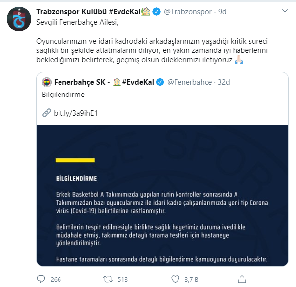 Oyuncularınızın ve idari kadrodaki arkadaşlarınızın yaşadığı kritik süreci sağlıklı bir şekilde atlatmalarını diliyor, en yakın zamanda iyi haberlerini beklediğimizi belirterek, geçmiş olsun dileklerimizi iletiyoruz