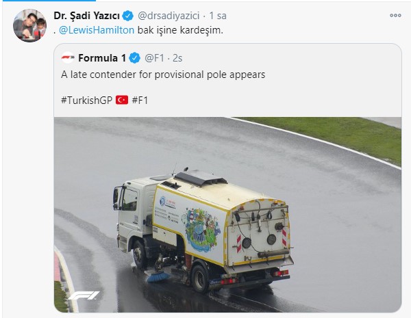 Bu sırada dünya şampiyonu pilot Lewis Hamilton, pistlerin kaygan olduğu mesajını paylaştı. Tuzla Belediye Başkanı Şadi Yazıcı da Hamilton'a Twitter hesabından "Lewis Hamilton, bak işine kardeşim" tepkisini gösterdi.