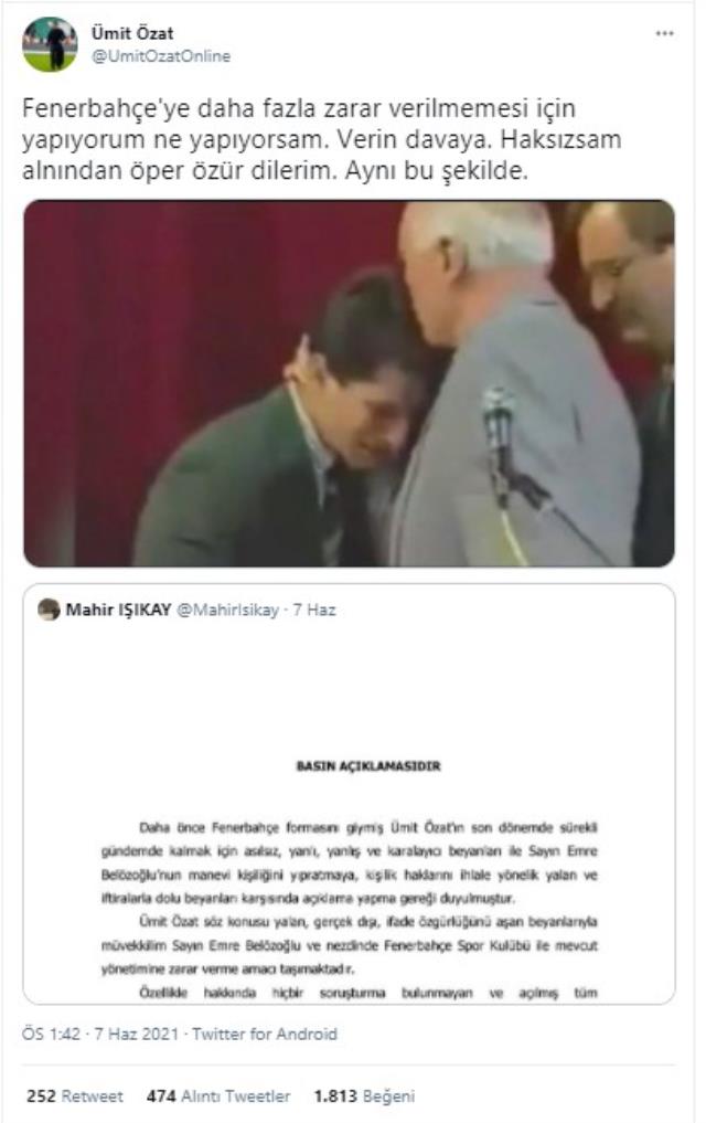 Ümit Özat, Emre Belözoğlu'nun avukatı Mahir Işıkay'ın suç duyurusu paylaşımını alıntılayıp, "Fenerbahçe'ye daha fazla zarar verilmemesi için yapıyorum ne yapıyorsam. Verin davaya. Haksızsam alnından öper özür dilerim aynı bu şekilde" notunu düştü. Eski Fenerbahçe muhabiri Göktuğhan Argın ise fotoğraftaki kişinin Mücteba Kılıç isimli şahsın olduğunu yazdı. Özat da bunun üzerine, "Fotoğraftaki o değilmiş. Zafer Biryol yalan mı söylüyor, Uğur Boral yalan mı söylüyor, Ömer Çatkıç yalan mı söylüyor. İfadelerinde Emre'nin evinde toplandıklarını söylüyorlar, onları da verin mahkemeye" diye kendisini savundu.