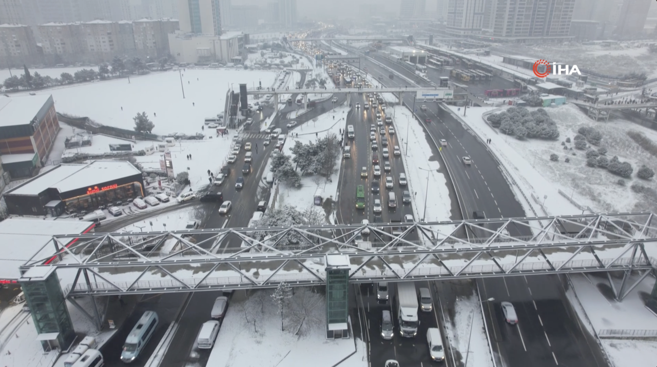Kar nedeniyle araçların güçlükle ilerlediği Çevre yolu havadan görüntülendi.