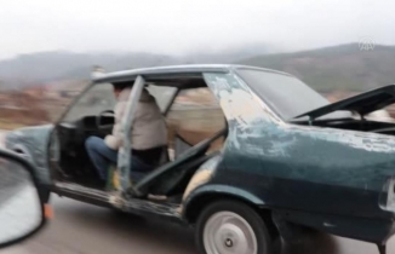Kapısı ve koltuğu olmayan otomobilde tehlikeli yolculuk