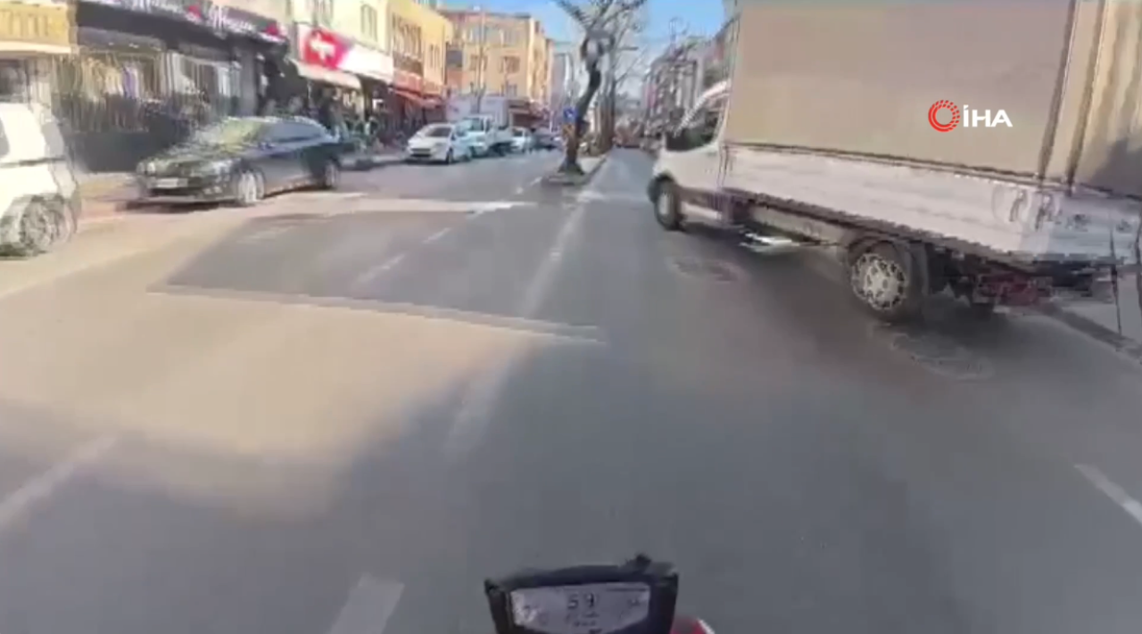 Bursa'da cadde üzerinde ilerleyen motosikletli, yola aniden çıkan kamyonete çarpmamak için manevra yapıp ters yöne girdi. Karşı taraftan gelen otobüse çarpıp durabilen sürücü, facianın eşiğinden döndü. O anlar kameraya yansıdı.