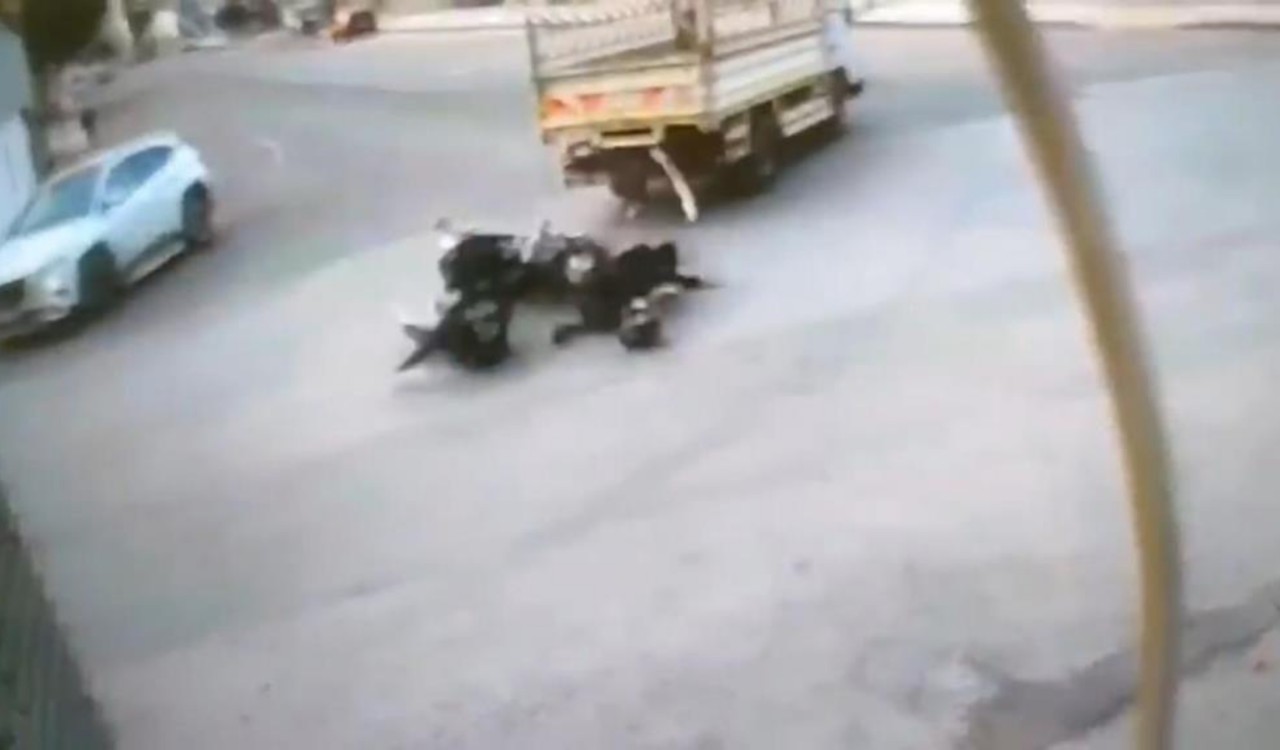 Mersin'in Erdemli ilçesinde motosiklette bulunan 2 kişi kamyonetin altında kalmaktan saniyeyle kurtuldu. Yaralı olarak hastaneye kaldırılan sürücü ve arkadaşının durumunun iyi oluğu öğrenildi. O anlar ise güvenlik kamerasına saniye saniye yansıdı.