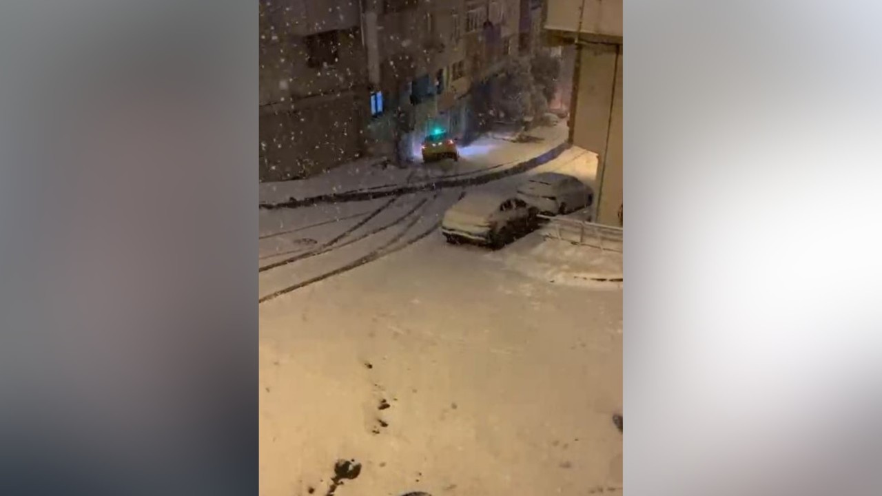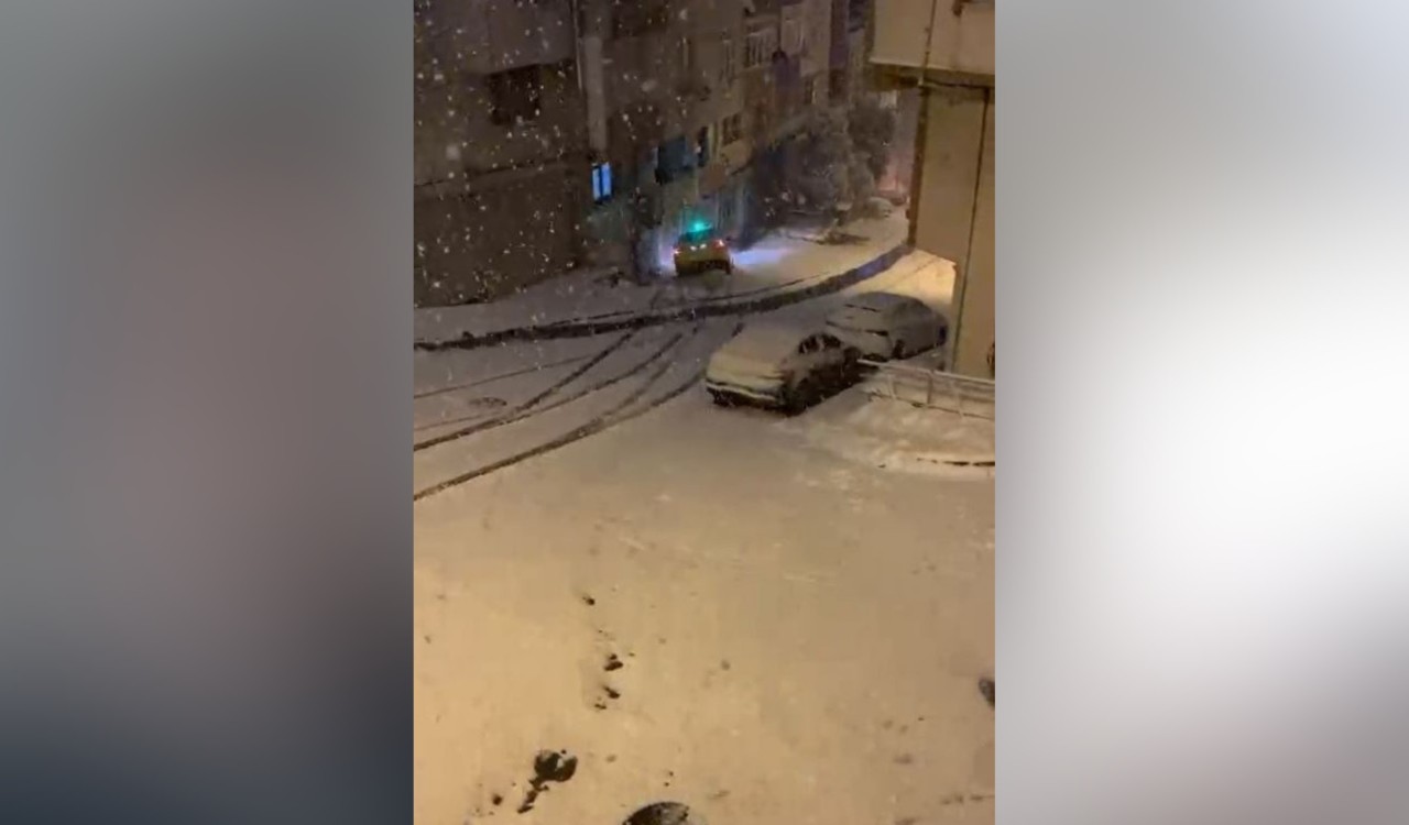 Eyüpsultan’da ticari bir taksi, kar nedeniyle kayganlaşan yolda yokuş aşağı bir apartmanın boşluğuna düştü. Taksi sürücüsü kazayı yara almadan atlattı.