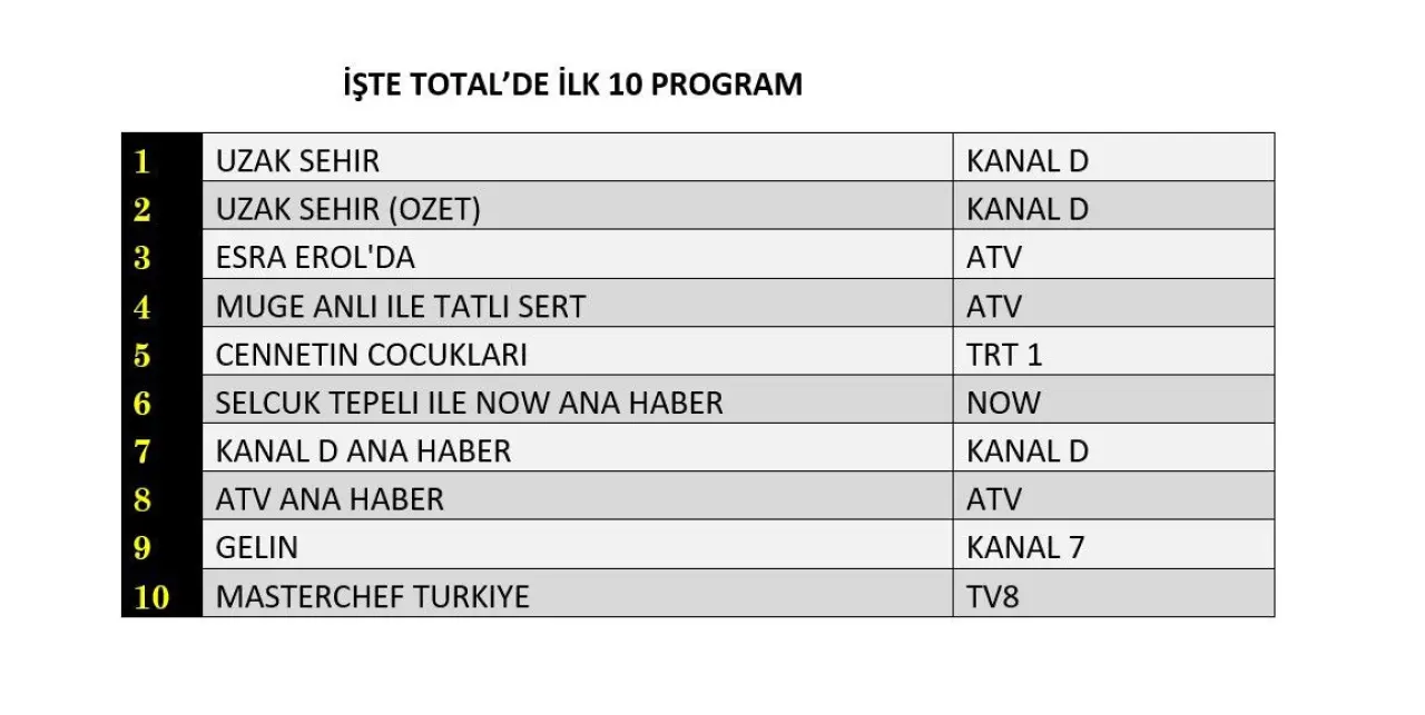 Geniş izleyici kitlesini temsil eden Total grubunda, Kanal D'nin sevilen dizisi "Uzak Şehir" birinci sıraya yerleşti. İzleyicilerin yoğun ilgi gösterdiği yapımın hemen ardından, kaçıranlar ve yeniden izlemek isteyenler için yayınlanan "Uzak Şehir" özet bölümü ikinci sırada yer aldı. Gündüz kuşağının fenomen programı "Esra Erol'da" ise günü üçüncü sırada tamamlayarak başarısını sürdürdü.