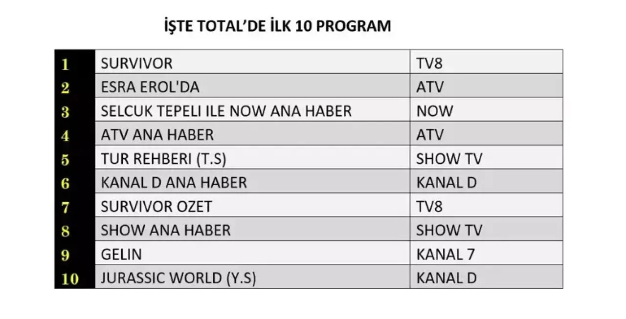 Sinema kuşağında ise "Tur Rehberi", "Jurassic World", animasyon filmi "Ferdinand" ve Türk komedi klasiği "Recep İvedik 2" gibi yapımlar izleyiciyle buluştu. Özellikle ailelerin ekran başında olduğu saatlerde yayınlanan bu filmler, reyting pastasından önemli bir pay almak için mücadele etti. TİAK tarafından ölçümlenen ve güncel olarak takip edilen sıralamada, bu yapımların hangisinin zirveye yerleştiği detaylı listelerle netlik kazanıyor.