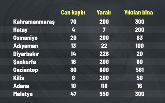 Bilançoya ilişkin son bilgileri veren Cumhurbaşkanı Yardımcısı Fuat Oktay, "İlk andan itibaren tüm bakanlarımızla birlikte AFAD'da toplanmaya başladık, gerekli görevlendirmeleri yaptık. Ekiplerimiz sahada. Kahramanmaraş'ta 70 vatandaşımızı kaybettik. Bu sayıların artacağını tahmin ediyoruz. Maraş'ta 200 yaralı var, 300 bina yıkıldı. Hatay'da 4 can kaybı, 7 yaralı ve 200 yıkım var. Osmaniye'de 20 kayıp, 200 yaralı ve 83 yıkılan bina; Adıyaman'da 13 kayıp, 22 yaralı, 100 yıkılan bina; Diyarbakır'da 14 vefat, 226 yaralı, 20 yıkım; Urfa 18 kayıp, 200 yaralı, 60 yıkılan bina; Antep'te 80 ölü, 600 yaralı, 581 yıkılan bina; Kilis'te 8 can kaybı, 200 yaralı, 50 yıkım; Adana'da 10 ölü, 118 yaralı, 16 yıkım; Malatya'da 47 ölü, 550 yaralı ve 300 yıkılan bina var. Toplam; 284 can kaybı, 2323 yaralı ve 1710 yıkılan bina var." ifadelerini kullandı.