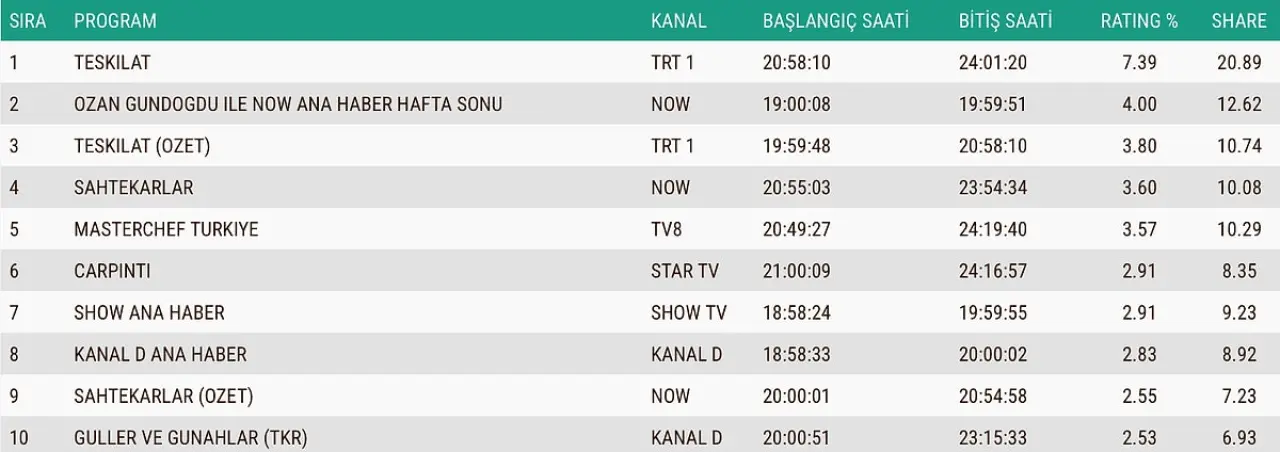 Günün reyting raporunda prime time dizilerinin detaylı sıralamaları dikkat çekti. Teşkilat dizisi zirvede yer aldı, Sahtekarlar ise AB ve ABC1 kategorilerinde ikinci sırada ve Total sıralamasında dördüncü oldu. Düşük reyting alan yeni diziler için izleyici ilgisinin yükselip yükselmeyeceği önümüzdeki haftalarda belli olacak. Reyting sonuçları televizyon kanallarının prime time stratejilerini ve gelecek yayın planlarını doğrudan etkilerken, pazar gecesi ekran başındaki dizi rekabetinin nabzı tutuldu.