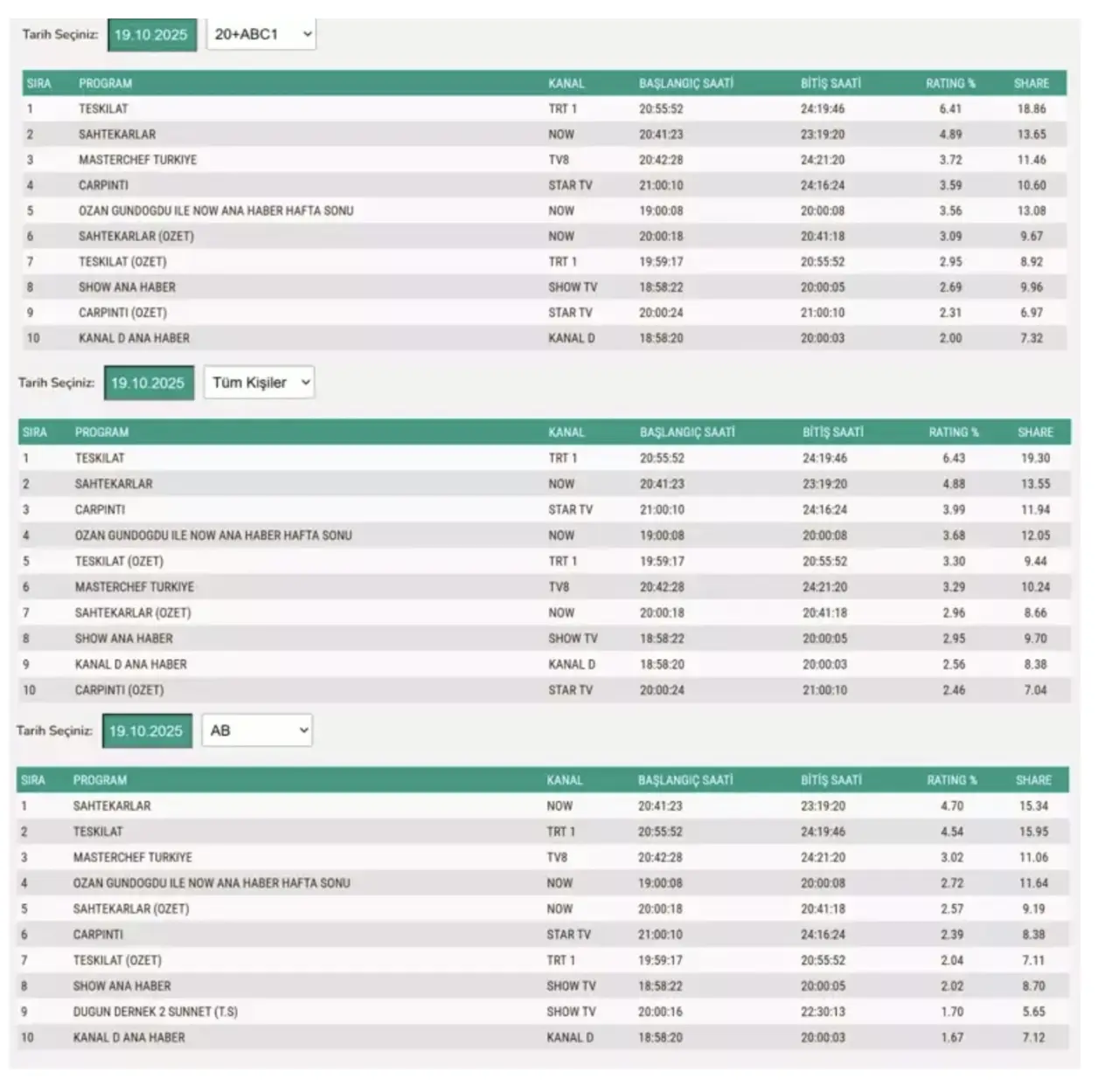 NOW ekranlarında yayınlanan Sahtekarlar dizisi, hem ABC1 hem de AB kategorilerinde ikinci sırada yer aldı. Dizi, %4,89 reyting alarak güçlü bir performans sergiledi. TV8’de yayınlanan MasterChef Türkiye ise %3,72 reyting ile günü üçüncü sırada tamamladı. Yarışma, hem ABC1 hem de Tüm Kişiler listelerinde ilk üçte yer aldı.
