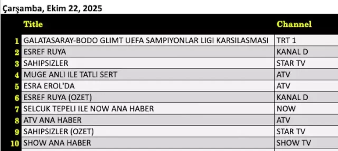 Türkiye'de televizyon izleyicileri her gün popüler dizilerin ve yarışma programlarının reyting sonuçlarını merak ediyor. 22 Ekim Çarşamba günü hem dizi hem de yarışma programları ekranda yer aldı. Özellikle Eşref Rüya, MasterChef, Sahipsizler, Aynadaki Yabancı, Bahar gibi yapımların yanı sıra Galatasaray ile Bodo/Glimt arasında oynanan Avrupa mücadelesi de gecenin dikkat çeken yayınları arasında oldu.