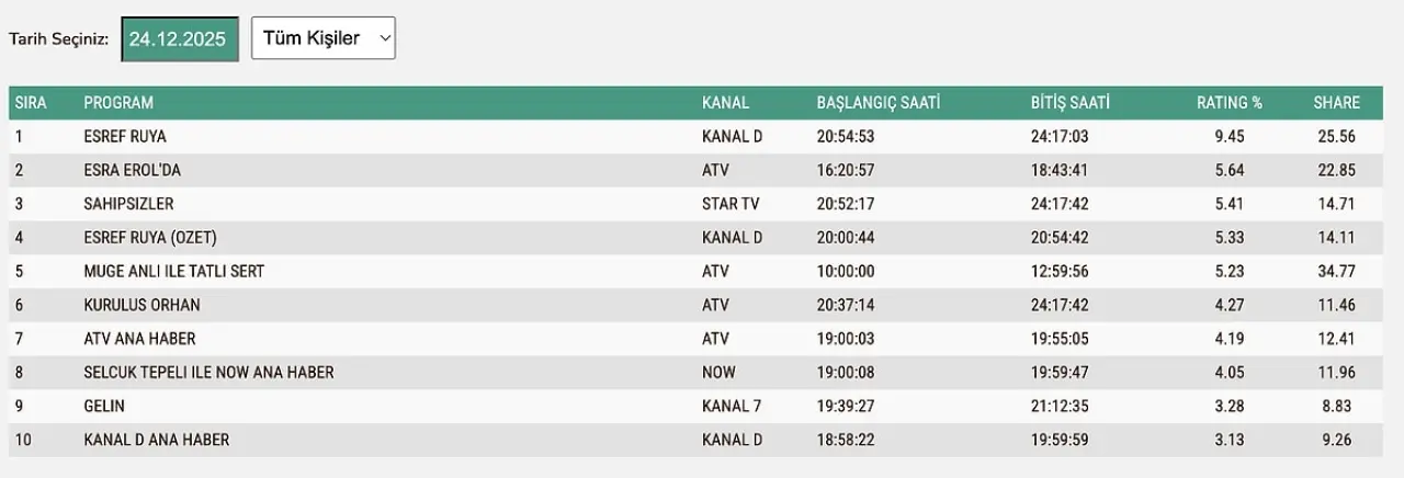 Kanal D’nin sevilen dizisi Eşref Rüya, 24 Aralık reytinglerinde geleneği bozmayarak günü yine birinci sırada tamamladı. Ancak dizi, geçtiğimiz hafta kırdığı reyting rekorunun ardından bu hafta "beklenmedik bir düşüş" yaşadı. Zirvedeki yerini korumasına rağmen izlenme oranlarındaki bu geri çekilme, dizinin sezon içerisindeki performans grafiğinde önemli bir kırılma noktası olarak kayıtlara geçti.
