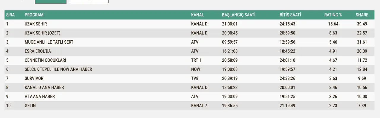 Total reyting sıralamasında da durum farklı değil. Uzak Şehir yine lider konumda bulunurken Survivor yedinci sıraya kadar geriledi. Müge Anlı ile Tatlı Sert ve Esra Erol'da programları, yarışmayı geride bırakmayı başardı.