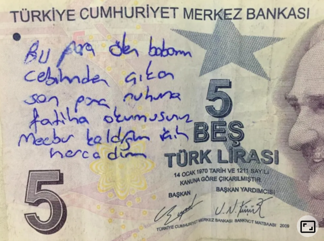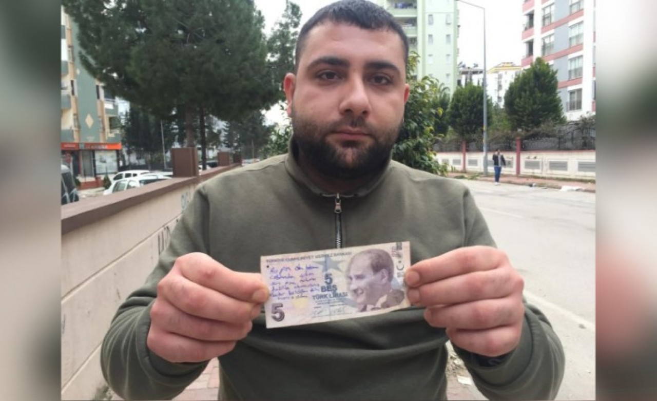 Çukurova ilçesine bağlı Mahfesığmaz Mahallesi'nde market işleten 26 yaşındaki Hasan Enes, gün sonu kasadaki paraları sayarken 5 liranın birinin üzerinde, “Bu para ölen babamın üzerinden çıkan son para, ruhuna Fatiha okur musunuz? Mecbur kaldığım için harcadım” notunu görünce şaşırıp üzüldü. Enes, hemen paranın sahibini bulmak için araştırma yaptı ancak bir türlü ulaşamadı.