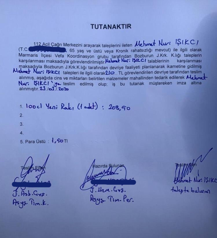 Jandarma da marketten aldığı 100'lük rakıyı Bozburunlu vatandaşa bir tutanakla teslim etti.