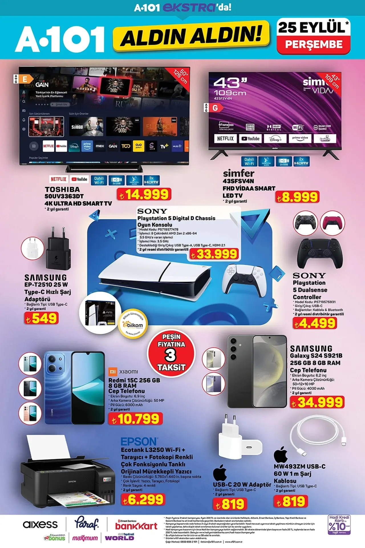 Türkiye'nin en büyük perakende zincirlerinden A101, 25 Eylül Perşembe günü için hazırladığı internete özel Aldın Aldın kataloğunu açıkladı. Katalogda teknoloji dünyasının en popüler ürünlerinden Sony Playstation 5 dikkat çekiyor. Yüksek talep gören bu oyun konsolu, internet üzerinden satışa sunuluyor ve fiziksel mağazalarda bulunmuyor. Ayrıca kataloğun öne çıkan diğer elektronik ürünleri ve kısa açıklamaları haberimizde.