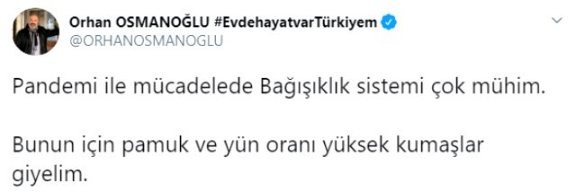 Orhan Osmanoğlu kişisel Twitter hesabından yaptığı, "Pandemi ile mücadelede Bağışıklık sistemi çok mühim. Bunun için pamuk ve yün oranı yüksek kumaşlar giyelim" paylaşımında bulundu.