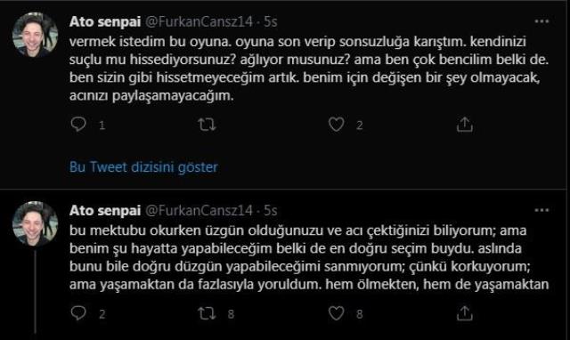 "Dün gece saatlerinde banyoda kendisini asarak intihar eden Furkan Cansız'ın kız arkadaşından yeni ayrıldığı öğrenilirken, intihar etmeden önce sosyal medya hesabında ise "Siz bu mektubu okuduğunuzda ben çoktan ölmüş olacağım ve ardımdan yaşananlardan hiç haberim olmayacak. Ben hayatı bir oyun olarak görüyordum, çok sıkıldım (çok sıktınız) ve artık son. Bu oyuna son verip sonsuzluğa karıştım. Kendinizi suçlu mu hissediyorsunuz, ağlıyor musunuz? Ama ben çok bencilim belki de. Ben sizin gibi hissetmeyeceğim artık. Benim için değişen bir şey olmayacak, acınızı paylaşamayacağım" diyerek paylaşım yaptığı öğrenildi.