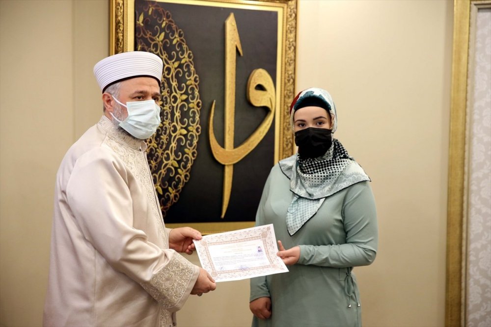 Konuşmaların ardından müftü Güven, Müslüman olan genç kıza, ihtida belgesini ve Kur'an-ı Kerim verdi.