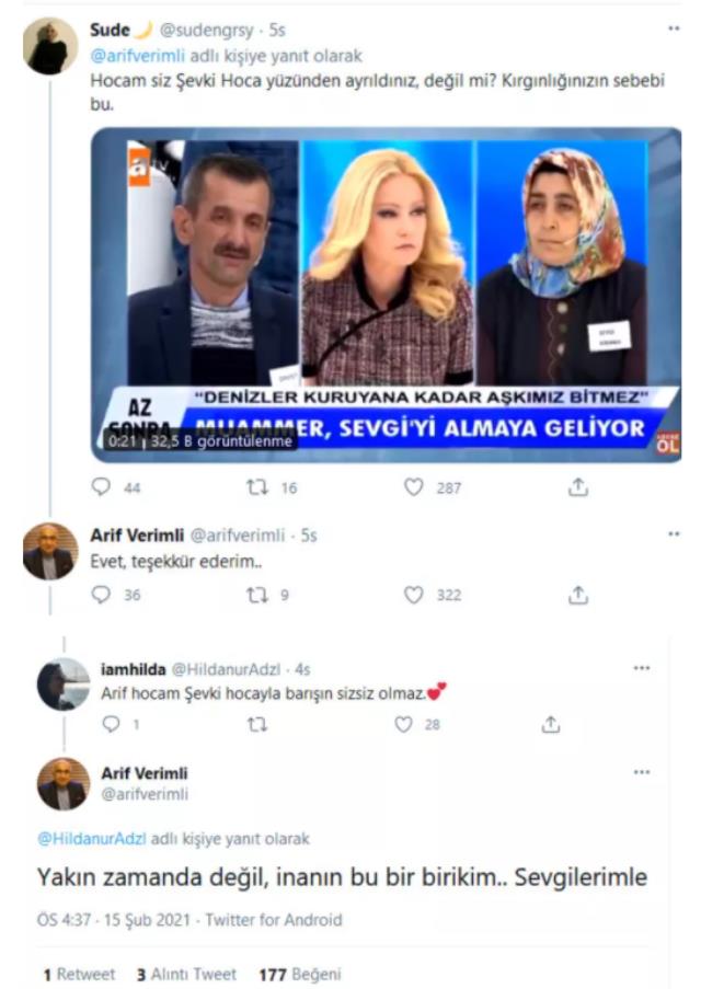 Yaklaşık 13 yıldır ekran karşısına çıkan Arif Verimli, paylaşımında ayrılık sebebini kişisel hassasiyetlerine dayandırdı. Ancak geçtiğimiz günlerde program arkadaşı Prof. Dr. Şevki Sözen'le yaşadığı tartışma, sosyal medya kullanıcıları tarafından hatırlatılınca, gerçeği açıklamak zorunda kaldı. Verimli, takipçisinden gelen, "Hocam siz Şevki hoca yüzünde ayrıldınız değil mi? Kırgınlığınızın sebebi bu." yorumu üzerine, "Evet, teşekkür ederim." diye konuştu.