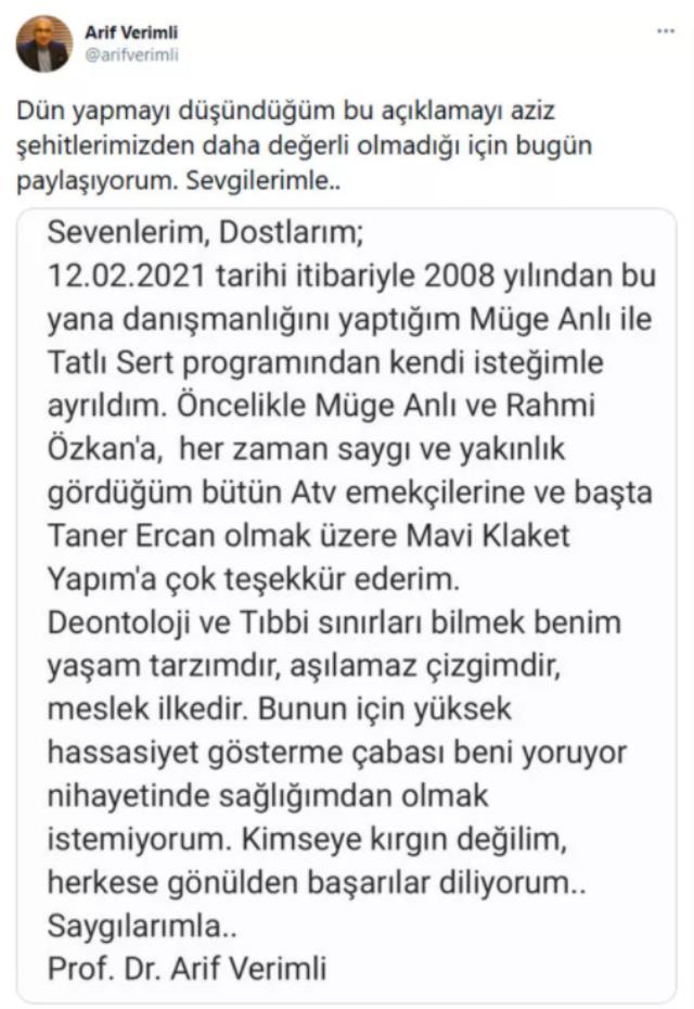 "Sevenlerim, Dostlarım; 12.02.2021 tarihi itibari ile 2008 yılından bu yana danışmanlığını yaptığım Müge Anlı ile Tatlı Sert programından kendi isteğimle ayrıldım. Öncelikle Müge Anlı ve Rahmi Özkan'a, her zaman saygı ve sevgi gördüğüm bütün ATV emekçilerine ve başta Taner Ercan olmak üzere Mavi Klaket Yapım'a çok teşekkür ederim. Deontoloji ve Tıbbi sınırlarımı bilmek benim yaşam tarzımdır, aşılamaz çizgimdir, meslek ilkemdir. Bunun için yüksek hassasiyet gösterme çabası beni yoruyor ve nihayetinde sağlığımdan olmak istemiyorum. Kimseye kırgın değilim, herkese gönülden başarılar diliyorum... Saygılarımla..."