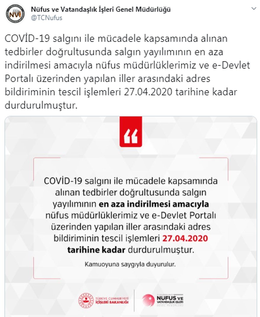 Müdürlüğün Twitter hesabından yapılan açıklamada “COVİD-19 salgını ile mücadele kapsamında alınan tedbirler doğrultusunda salgın yayılımının en aza indirilmesi amacıyla nüfus müdürlüklerimiz ve e-Devlet Portalı üzerinden yapılan iller arasındaki adres bildiriminin tescil işlemleri 27.04.2020 tarihine kadar durdurulmuştur” ifadeleri kullanıldı.