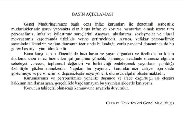 Öte yandan Ceza ve Tevkifevleri Genel Müdürlüğü de konuya ilişkin bir açıklama yayınladı. Söz konusu metinde, "Kurumlarımız ve personelimize yönelik düşünce ve ifade özgürlüğü ile eleştiri hakkının sınırlarını aşan, gerçeklikle bağdaşmayan bu yayınları şiddetle kınıyoruz. Konunun takipçisi olunacağı kamuoyuna saygıyla duyurulur."