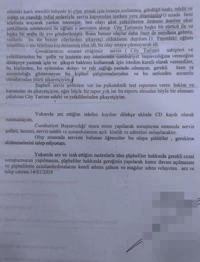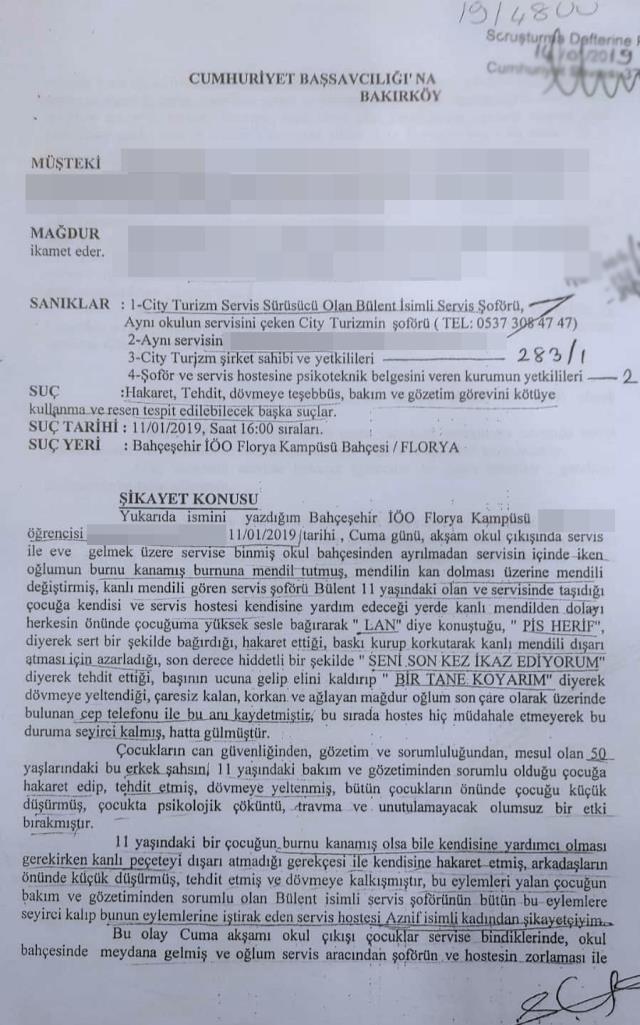 "Bahçeşehir Florya Kampüsü'nde okuyan oğlum, akşam okul çıkışında eve gelmek üzere servise binmiş olup kul bahçesinden ayrılmadan servisin içindeyken oğlumun burnu kanamış. Burnuna mendil tutmuş, mendilin kan dolması üzerine mendili değiştirmiş. Kanlı mendili gören servis şoförü Bülent, 11 yaşındaki olan ve servisle taşıdığı çocuğa kendisi ve servis hostesi kendisine yardım edeceği yerde kanlı mendilden dolayı herkesin önünde çocuğuma yüksek sesle bağırarak 'LAN' diye konuştuğu, 'PİS HERİF' diyerek sert bir şekilde bağırdığı, hakaret ettiği, baskı kurup korkutarak kanlı mendili dışarı atması için azarladığı, son derece hiddetli bir şekilde'SENİ SON KEZ İKAZ EDİYORUM' diyerek tehdit ettiği, başının ucuna gelip elini kaldırıp 'BİR TANE KOYARIM' diyerek dövmeye yeltendiği, çaresiz kalan, korkan ve ağlayan mağdur oğlum son çare olarak üzerinde bulunan cep telefonu ile bu anları kaydetmiştir. Bu sırada hostes hiç müdahale etmeyerek bu duruma seyirci kalmış, hatta gülmüştür.