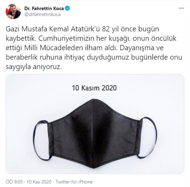 Ancak Bakan Koca'nın yukarıdaki metne görsel olarak siyah maskeyi tercih etmesi bir anda sosyal medyanın gündemine oturdu. Bakan Koca'nın paylaşımını eleştiri yağmuruna tutan sosyal medya kullanıcıları gönderinin altına "Ne alaka maske?", "Su görsel size yakışıyor mu? Gerçekten çok ayıp, yazık", "Sosyal medyanızı yöneten ajans adına utandım", "Maske koyacağına adamın bir fotosunu koysaydın daha iyiydi" şeklinde yorumlar yaptı. Bunun yanı sıra çok sayıda kullanıcı tepki olarak paylaşımın altına Mustafa Kemal Atatürk'ün fotoğraflarını ekledi.