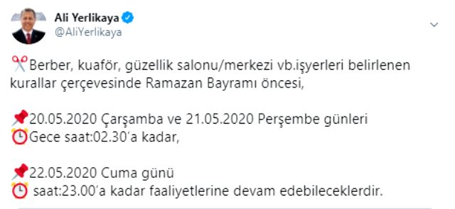 Ali Yerlikaya çalışma saatleriyle ilgili Twitter hesabından yaptığı paylaşımda, "Berber, kuaför, güzellik salonu/merkezi vb. iş yerleri belirlenen kurallar çerçevesinde Ramazan Bayramı öncesi, 20.05.2020 Çarşamba ve 21.05.2020 Perşembe günleri gece saat 02.30'a kadar, 22.05.2020 Cuma günü saat 23.00'a kadar faaliyetlerine devam edebileceklerdir." ifadelerini kullandı.
