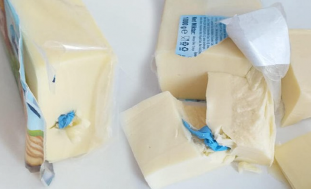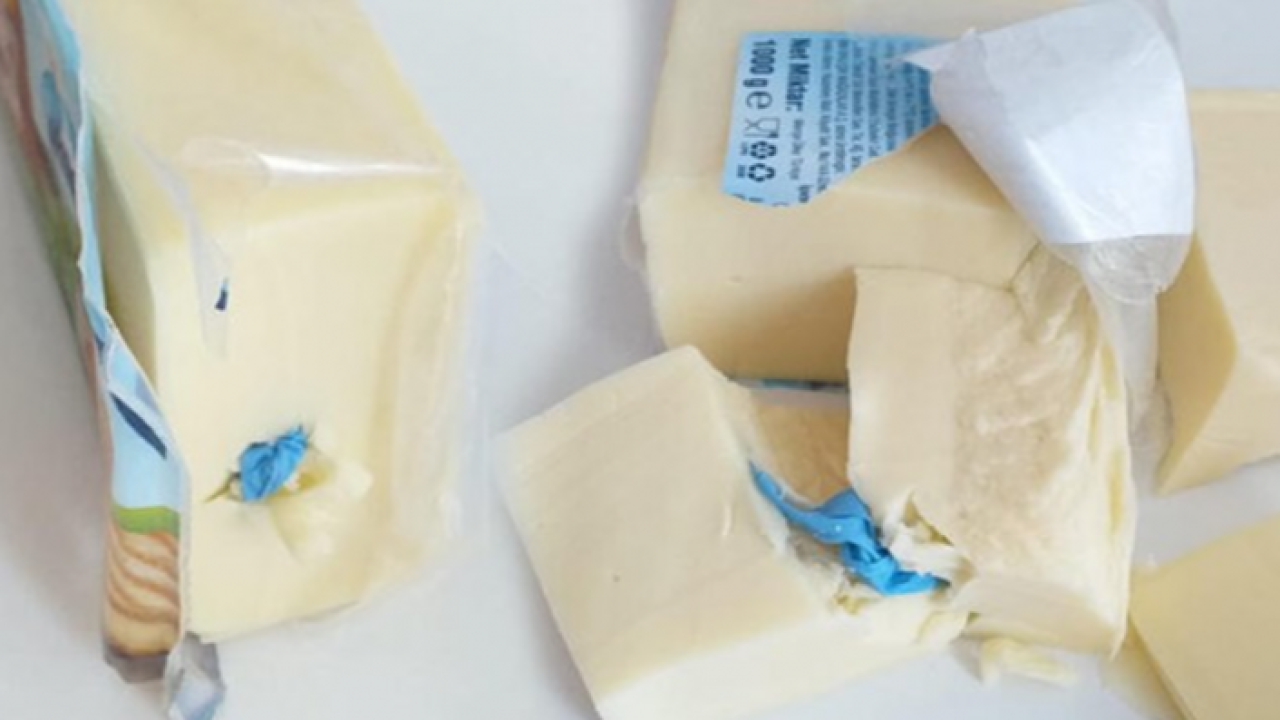 Eve geldiğinde peyniri kesen Ayşe Emer, içerisinden çıkan lastik eldiveni görünce şaşkınlık yaşadı.