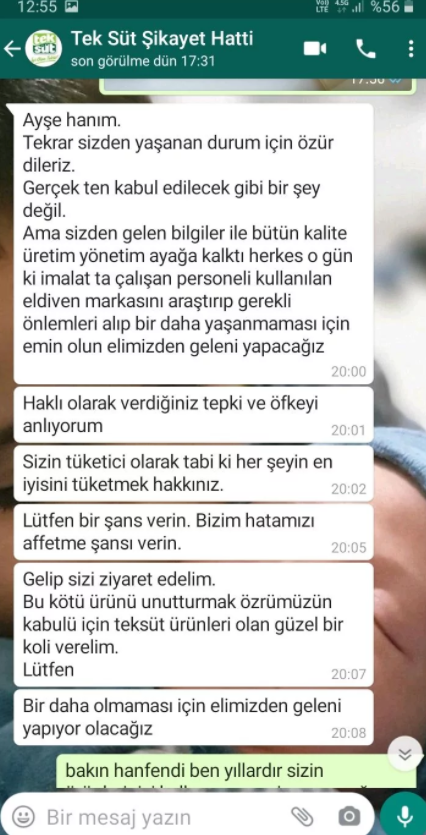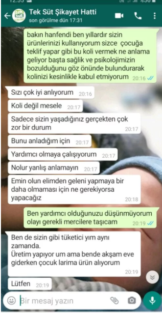 Ürünün fotoğraflarını çekerek üretici firmanın şikayet hattına yazan Ayşe Emer'e, hatanın telafisi içinTek Süt firması gıda kolisi gönderilmesi teklif edildi.